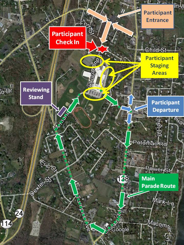WHAT IF I AM A PARTICIPANT? All participants must enter the staging area via Sprague St. and Education Ln. (which will be one way - North). There is some parking for vehicles transporting participants on the High School parking areas. Parade Officials (in bright yellow tee shirts) can help direct you. Exiting vehicles after drop off must exit via Patriots Dr (Which will be one way East to East Main Road). There will be a check in station at the top of Education Dr where a parade official will direct you to the proper staging area.